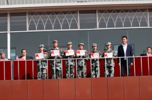 开学典礼在庄严的国歌声中拉开了帷幕,鲜红的五星红旗徐徐升起。随后,校长助理、学生处处长高洪震宣读了军训获奖名单;主席台上就座的各位领导为依次走上台前的教官和学生代表颁发了荣誉证书,并合影留念。