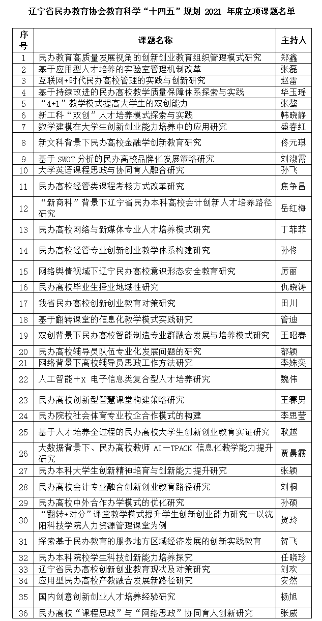 日前,辽宁省民办教育协会公布了《辽宁省民办教育协会关于批准教育科学“十四五”规划2021年度立项课题的通知》(辽民教协发〔2021〕1号)文件,经本人申报、学校遴选推荐、辽宁省民办教育协会学术委员会专家评审,由我校教师郑鑫主持申报的《民办教育高质量发展视角的创新创业教育组织管理模式研究》等36项课题获得批准立项。这是我校首次参与辽宁省民办教育协会的课题工作,取得如此佳绩是我校将“创新创业教育”全面融入教学科研获得成效的重要体现,为我校2021年度科研教研工作又添一重大成果!