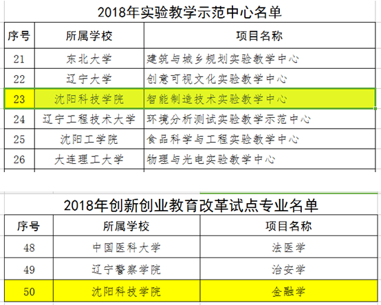 近日,辽宁省教育厅公布了《2018年度高等教育内涵发展—转型与创新创业教育项目遴选结果》。经审核,我校申报的“智能制造技术实验教学中心”和“金融学专业”分别入选2018年实验教学示范中心和2018年创新创业教育改革试点专业。今年8月,辽宁省教育厅下发了《关于做好2018年度高等教育内涵发展—转型与创新创业教育项目申报工作的通知》。在学校的高度重视和组织领导下,各系部认真学习通知精神和申报指南,结合实际情况提出了申报意向。经过学校严格筛选后,确定了推荐“智能制造技术实验教学中心”和“基础化学应用创新实验教学中心”申报2018年实验教学示范中心,推荐“应用化学专业”和“金融学专业”申报2018年创新创业教育改革试点专业。并最终有2个申报项目成功入选。