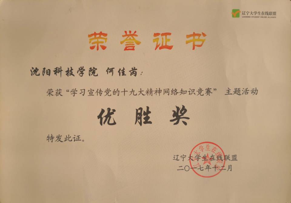 近日,由辽宁省大学生在线联盟、辽宁工业大学联合开展的学习宣传党的十九大精神网络知识竞赛成绩揭晓,我校化学工程系化学工程与工艺专业学生何佳芮获得优胜奖。
