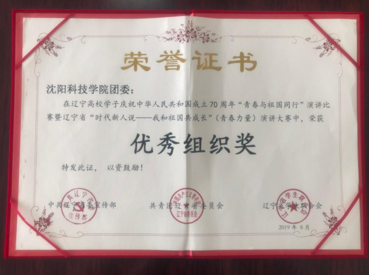 日前,由中共辽宁省委宣传部、共青团辽宁省委员会、辽宁省学生联合会、中共丹东市委宣传部举办的庆祝中华人民共和国成立70周年“青春与祖国同行”演讲比赛暨辽宁省“时代新人说——我和祖国共成长(青春力量)演讲大赛成绩揭晓。经过激烈竞争我校荣获“优秀组织奖”荣誉称号。