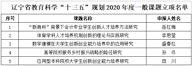 为全面贯彻习近平总书记关于教育的重要论述和中共中央关于评价改革等一系列政策方针精神,大力推进教育科研创新,增强服务和支撑辽宁教育现代化发展的能力,根据辽宁省教育科学规划领导小组办公室《关于申报辽宁省教育科学“十三五”规划2020年度立项课题的通知》,我校在全面推行创新创业教育实践研究工作基础上,组织校内教师积极申报,学校集中遴选推荐,重点打造,高质量完成此次课题申报工作。日前,辽宁省教育科学规划领导小组办公室发布了《关于批准辽宁省教育科学“十三五”规划2020年度立项课题的通知》(辽教科规办字〔2021〕4号),我校申报的《“新商科”背景下会计专业学生创新人才培养方法研究》等五项课题获得批准立项。