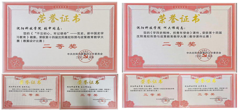 近日,沈阳市委教科工委公布了2021年沈阳高校形势与政策专项教育活动获奖情况。在此次活动中,我校多名教师获得奖项。其中,张申老师获得教案设计比赛二等奖,刘大伟、张璐老师获得教案设计比赛三等奖。何大伟老师获得教学课件比赛二等奖,刘芳、李淑娟老师获得教学课件比赛三等奖。