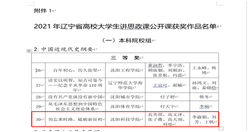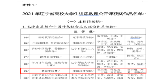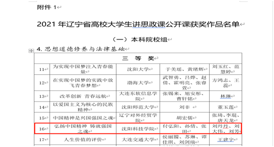为深入贯彻落实习近平总书记关于教育思想的重要论述,特别是在学校思想政治理论课教师座谈会上的重要讲话精神,用习近平新时代中国特色社会主义思想铸魂育人,着力提高思想政治理论课教学质量,进一步加强思政教师队伍建设,我校思政部组织师生参加了省委教育工委、省教育厅开展的“2021年度辽宁省高校思想政治理论课创优计划”系列活动,并取得了优异成绩。