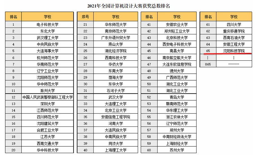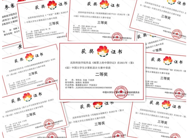 在2021年第十四届中国计算机设计大赛中,我校斩获25项国家级奖励,分别是二等奖1项、三等奖9项,优秀奖15项,我校荣获优秀组织单位奖。获奖总数在全国参赛的856所高校中排名第65位,在辽宁省参赛的高校中排名第10位。