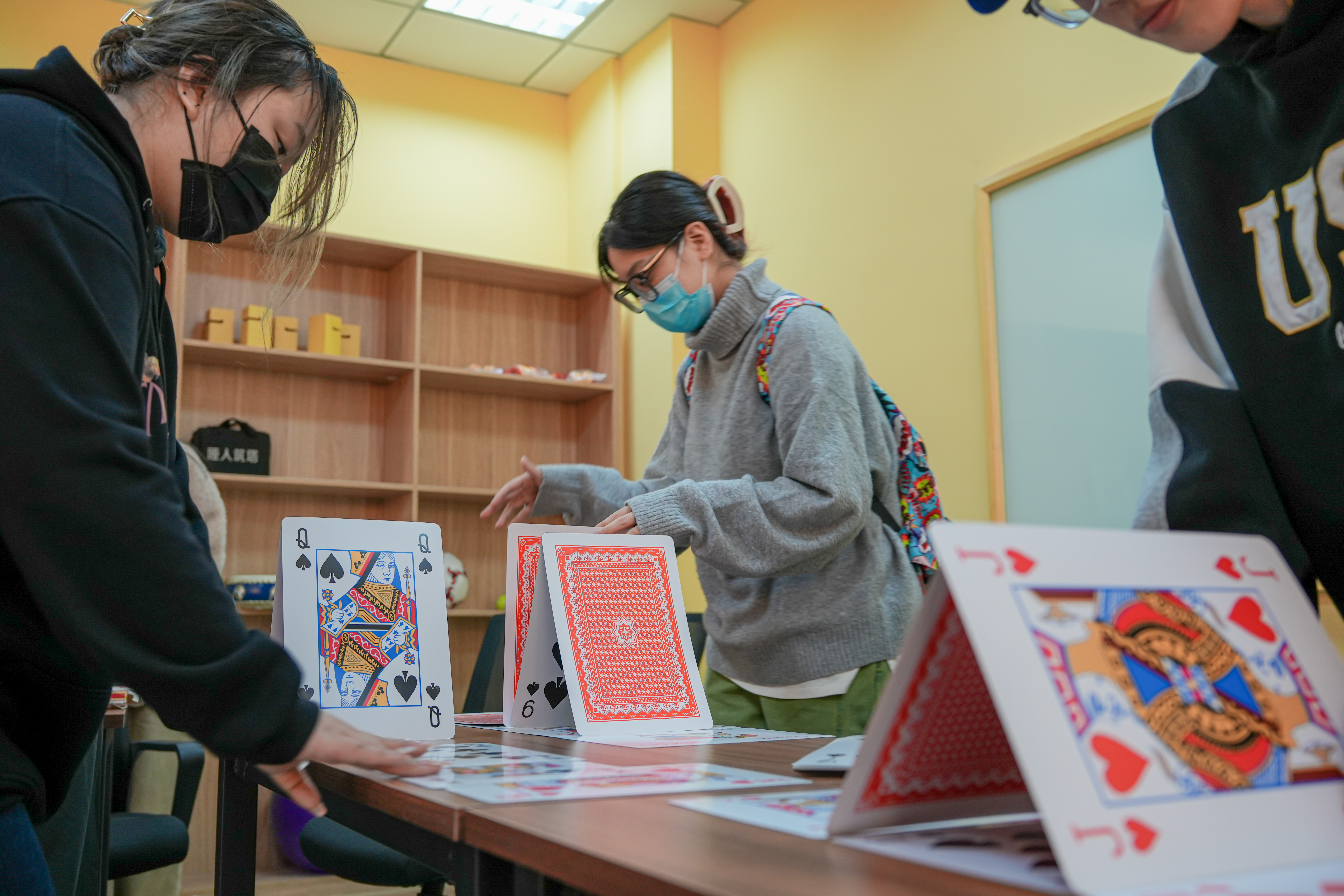 推开门,映入眼帘的是围成一圈的桌椅,大家围坐在这里进行一个又一个小游戏,增进感情。同心协力一起接球,或是分成小组进行其它各种有趣的游戏,例如:需要团队合作的哑人筑塔、竞技对抗类的光盘争夺等。