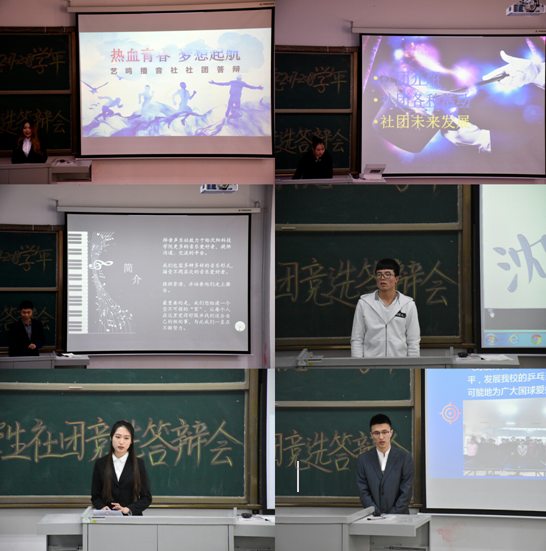 答辩过程中,各个社团负责人从社团发展历程、日常的活动形式、活动内容以及社团未来的展望等方面来进行展示。参与答辩的社团还进行了现场表演,艺鸣播音社的诗朗诵,魔术社的“预言”魔术表演,桦音声乐社的歌唱表演,以及乒乓球社,静纤瑜伽社,沈科武术社日常活动的短片播放都得到了评委们的肯定,各位评审教师也针对各社团的存在不足以及以后应如何发展提出了建设性的意见和建议。