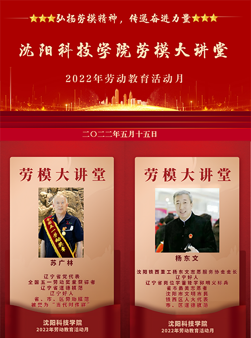 2022年5月为我校劳动教育活动月。为进一步推动我校劳动教育工作,宣传劳动榜样人物事迹,让学生接触劳动模范,聆听劳模故事,感受并领悟勤勉敬业的劳动精神,坚定理想信念,提升职业素养,争做新时代的奋斗者,5月15日上午,学生处线上举行劳动教育活动月——劳模大讲堂。邀请到辽宁省党代表、全国五一劳动奖章获得者、辽宁省道德模范、省市区劳动模范苏广林,辽宁好人、辽宁省岗位学雷锋学郭明义标兵、省市最美志愿者、市区道德模范杨东文作专题讲座,向同学们讲述他们的人生经历和感悟。