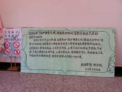 各系部积极组织主题班会,组织学生集体宣誓、签字,并主动承诺:“自愿参加“维护课堂文明,铸就良好学风”自觉行动活动,自觉履行《课堂教学规范》等有关规定,自觉做到上课课前起立、不迟到不早退、上课不玩手机等电子设备、不旷课、不看与课堂无关的书籍、上课不带食品、保持教室卫生,为维护我校教学秩序,建设良好学风贡献一份力量。”
