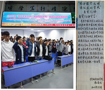 各系“维护课堂明文,铸就良好学风”主题班会开展得如火如荼。班会上,各班级学生在辅导员的号召下,在班级干部的带领和倡议下,集体郑重宣誓:端其心、诺其行,坚决遵守学校“遵守课堂规范”的规定,努力创建文明课堂,并在“自觉行动”倡议书上郑重签字。