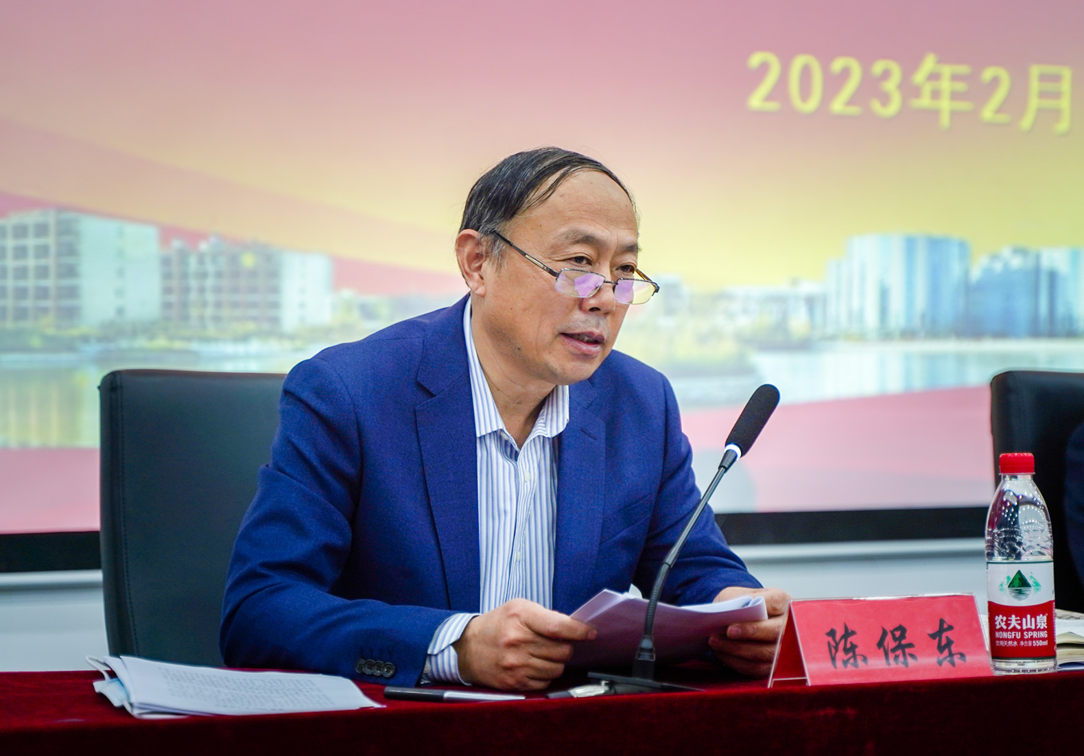 校长陈保东从扎实推进党建工作落实落细,顶层布局合格评估工作、完善学校顶层设计,加强教学过程管理、全面提升人才培养质量,创新学生工作新局面、促进学生全面健康成长,全面优化人才引进和教师培养机制,产教协同育人工作,创新创业教育工作,基础建设及各类保障工作,统筹做好疫情防控工作等九个方面,全面回顾了2022年取得的成绩及工作完成情况。同时,对接下来迎接本科合格评估及学校工作进行详细部署,2023年学校党政工作要点:一是深入学习贯彻习近平新时代中国特色社会主义思想和党的二十大精神,进一步推进思想政治工作。二是以建设学校高质量体系为目标,做好治理结构建设工作。三是进一步明确学校办学定位、办学理念、发展战略等学校发展顶层设计工作。四是完善内部管理制度建设。五是全面加强基层党组织建设。六是持续开展2023年本科教学改革项目建设工作。七是实施教学质量自评估。八是持续加强课程和课程思政建设。九是继续开展2023年磨课工作。十是强化教师培养,大力提升科研及实验设备的质量和投入。十一是深化校企合作。十二是依托集团产业优势,建设产业研究院、现代产业学院。十三是加大人才引进力度,优化师资力量。十四是组织开展预评估工作,做好合格评估支撑材料组建和自评估报告质量提升工作,做好合格评估联络员队伍和工作队伍的建设。十五是以“六大育人体系”要求为引领,持续推进“两站”、“五项工程”工作开花结果。十六是开展丰富多彩的学生活动及扎实做好招生和就业工作。十七是高标准高质量推进基础设施的建设。陈校长最后强调在集团的支持下、学校领导班子的带领下希望大家齐心协力,打赢这场教学工作合格评估攻坚战。