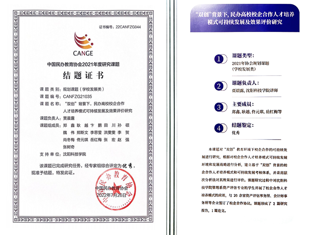 我校管理与传媒系教师贾晨露主持的课题《“双创”背景下,民办高校校企合作人才培养模式可持续发展及效果评价研究》获得中国民办教育协会2021年度规划课题优秀等级。中国民办教育协会2021年度规划课题已组织两期结题工作,共评选出八个优秀成果,优秀成果在“中国民办教育协会2023学术年会”上展出。