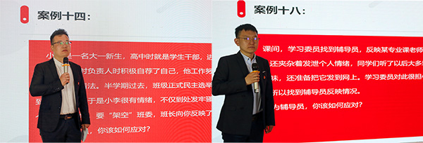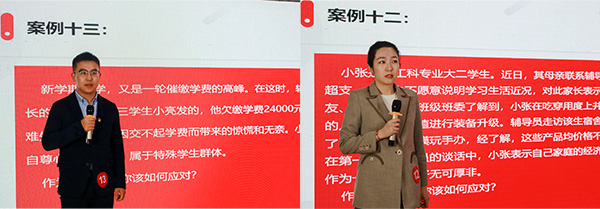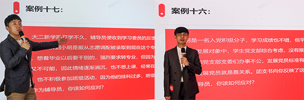 在案例分析环节,参赛选手将工作中出现的典型案例进行全面的解读和分析,案例内容涉及理想信念教育、贫困生帮扶、学业指导、校园文明、寝室矛盾、学生入党、国家奖助等内容,各参赛选手结合多年工作经验,牢牢抓住问题关键点,深入浅出地对案例进行分析和有效的解决。
