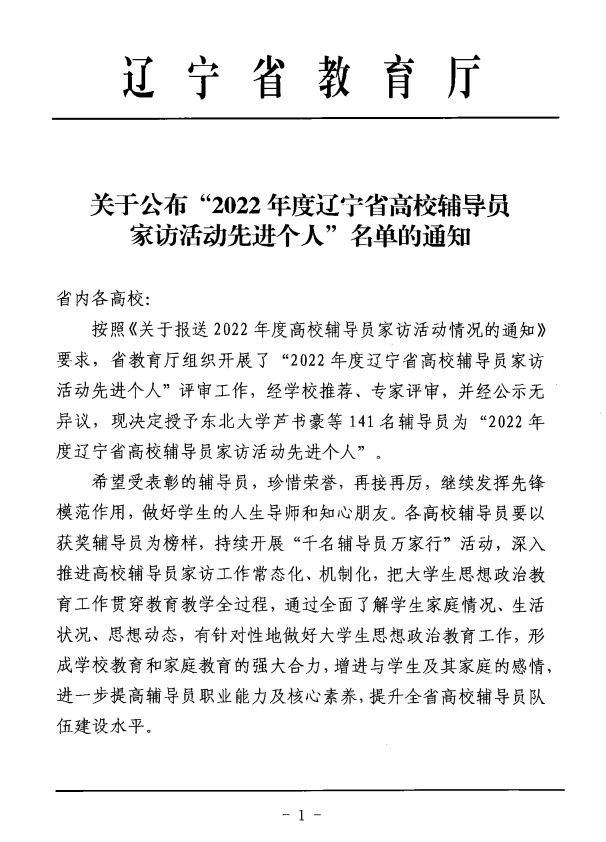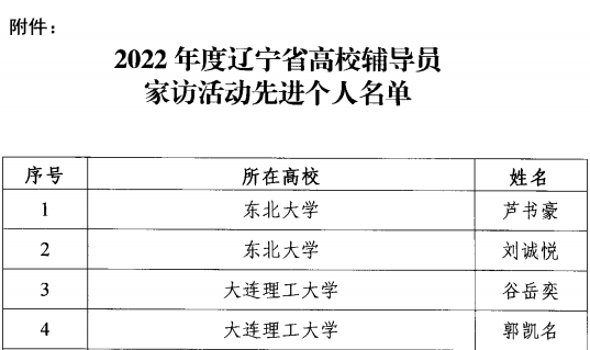 近日,省教育厅组织开展了“2022年度辽宁省高校辅导员家访活动先进个人”评审工作。经个人申报、系部推荐、校内评审、学校推荐、专家审核,我校辅导员李倩、常舒扬荣获“2022年度辽宁省高校辅导员家访活动先进个人”荣誉称号。