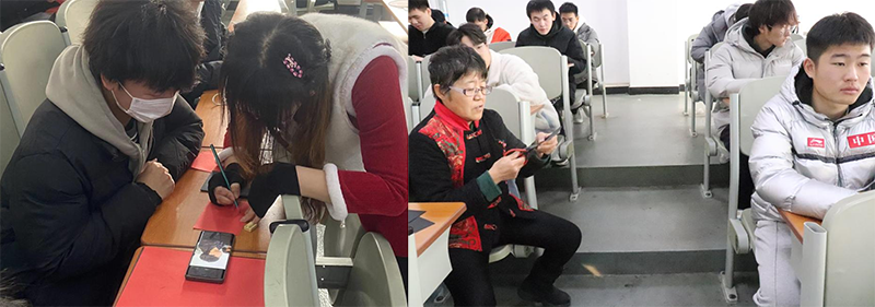 现场同学们积极参与剪纸技艺的交流,亲手制作了一件件精美的剪纸作品并互相展示,热情高涨地交流剪纸制作学习心得,总结活动带来的收获。传承人与学生们大胆创新,尝试软笔书法与剪纸技艺相融合,与现场同学们共同创作了作品——《沈科人》。