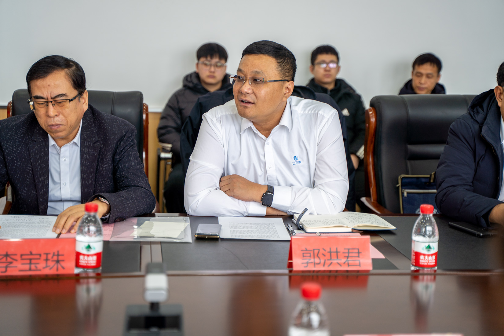辽宁山水清环保科技有限公司董事长兼总经理郭洪君致辞,他首先介绍了山水清“两水两固一张网”的发展战略及发展概况,污水处理、饮用水安全、污泥干化、垃圾焚烧技术研发和相关产品设备,他指出双方可以通过共建应用型人才培养基地、实习就业育人基地等举措,从产学研、专家组组建、就业实践联合培养等方面深入合作。