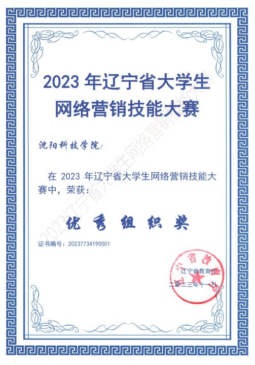 在2023年辽宁省大学生网络营销技能大赛中,荣获一等奖3项、二等奖4项、三等奖1项,并获“优秀组织奖”称号。