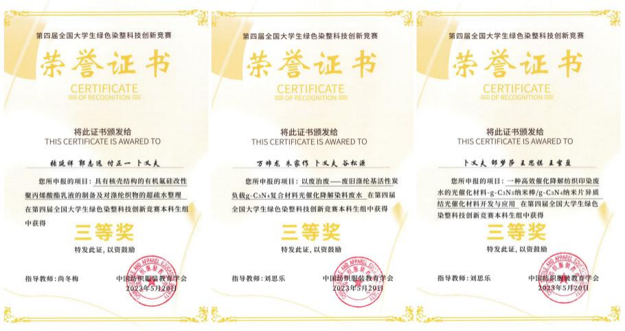 在第四届全国大学生绿色染整科技创新竞赛中,荣获三等奖3项。