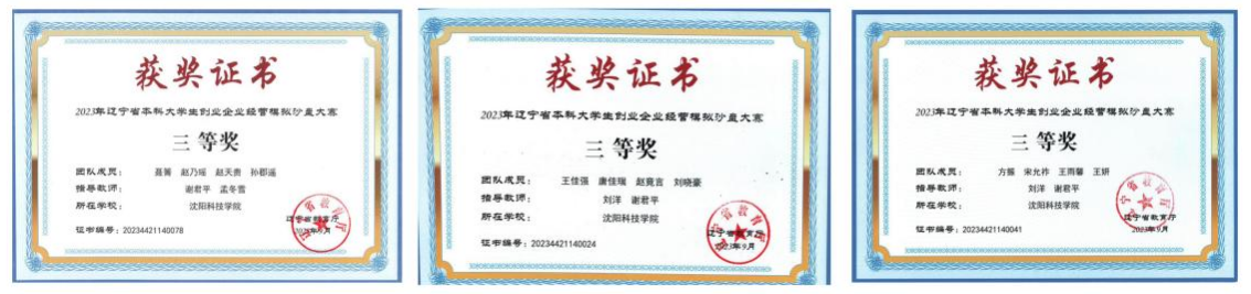 在2023年辽宁省普通高等学校本科大学生创业企业经营模拟沙盘大赛(辽宁赛区)中,荣获三等奖3项。