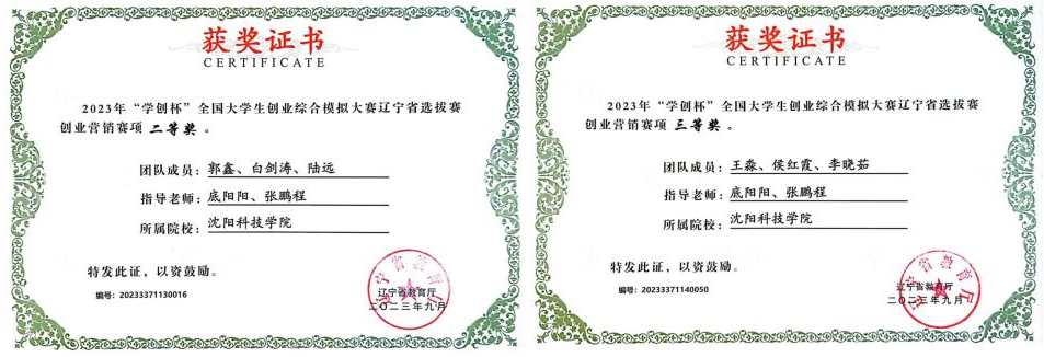 在2023年“学创杯”全国大学生创业综合模拟大赛辽宁省选拔赛创业营销赛中,荣获二等奖1项、三等奖1项。
