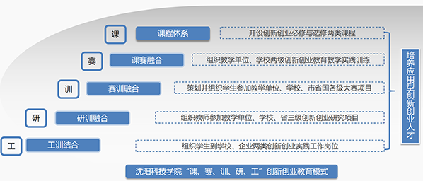 创新创业教育学院开设了必修与选修两类课程,通过组织教学单位、学校两级创新创业教育教学实践训练,策划并组织好学生参加教学单位、学校、市省国各级大赛项目,组织教师参加教学单位、学校、省三级创新创业研究项目,组织学生到学校、企业两类创新创业实践工作岗位,培养应用型创新创业人才,形成了“课、赛、训、研、工”相结合的应用型创新人才培养模式。