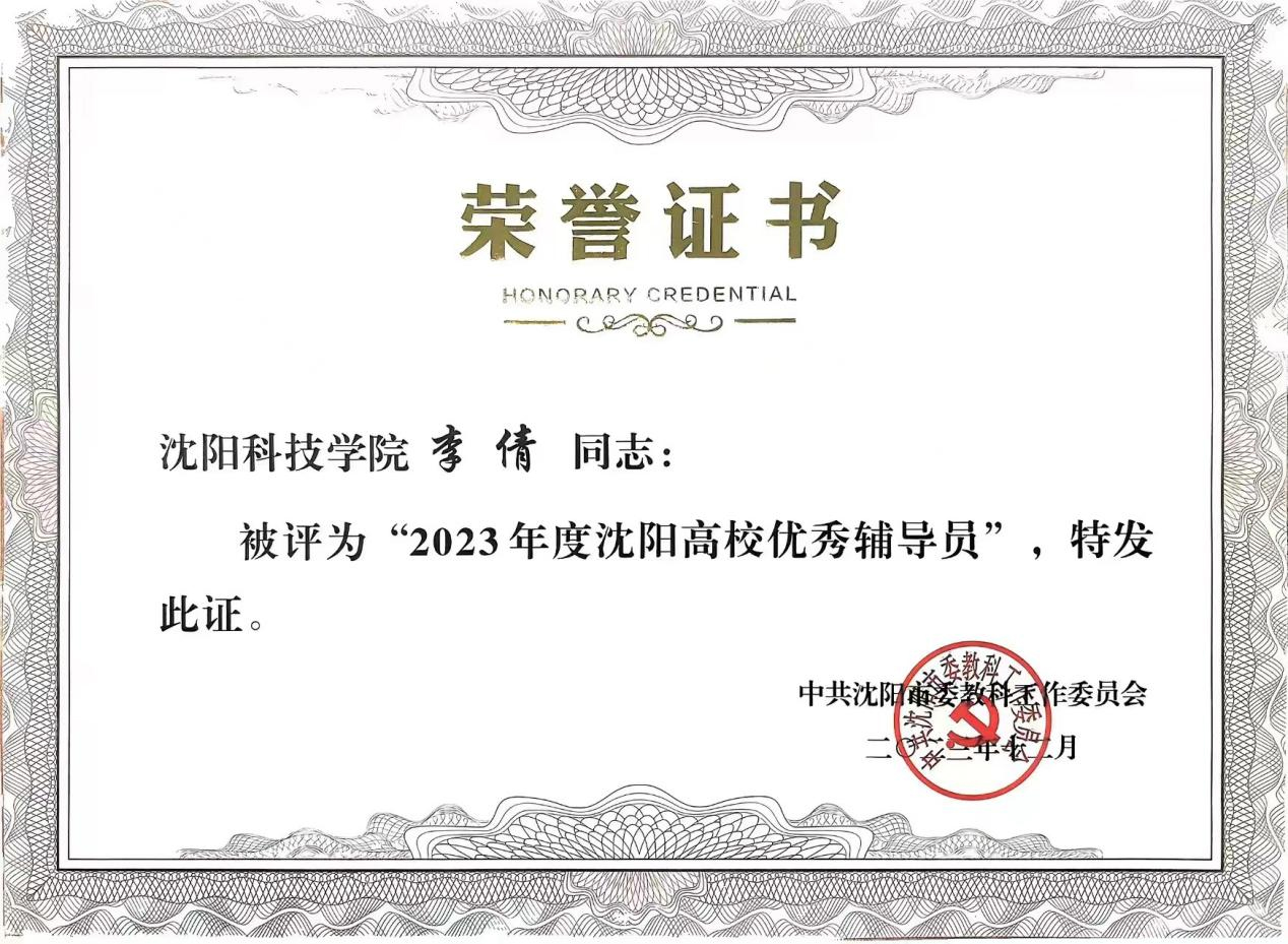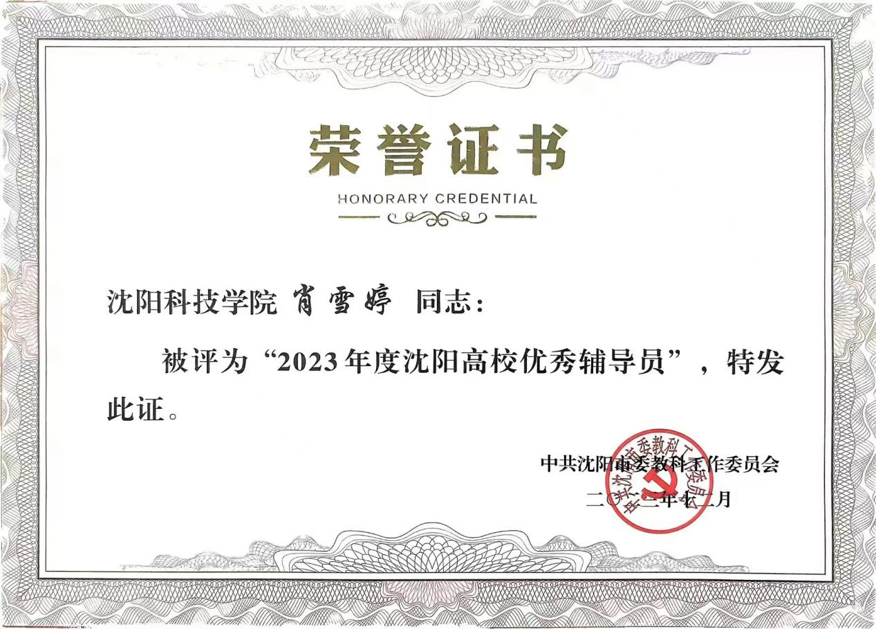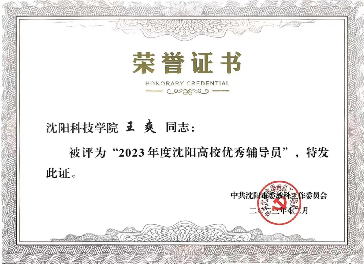 近日,中共沈阳市委教科工作委员会组织开展了“2023年度沈阳高校优秀辅导员、优秀学生工作干部”评审工作。经个人申报、系部推荐、校内评审、学校推荐、专家审核,我校辅导员王爽、田野、杨阳、李倩、黎明东、蒋明儒、肖雪婷荣获“2023年度沈阳高校优秀辅导员”荣誉称号。我校宋和发、施芳芳、李金霖荣获“2023年度沈阳高校优秀学生工作干部”荣誉称号。