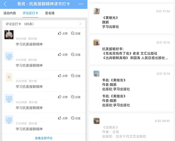 易班学生工作站采用“易班”APP、“沈科易班”微信公众号等网络平台,开展线上读书打卡活动,同学们可以在评论区互动、分享学习抗美援朝精神学习心得。线上读书打卡活动的开展,有效推动了抗美援朝精神与网络思政有机融合,确保活动效果取得实效。