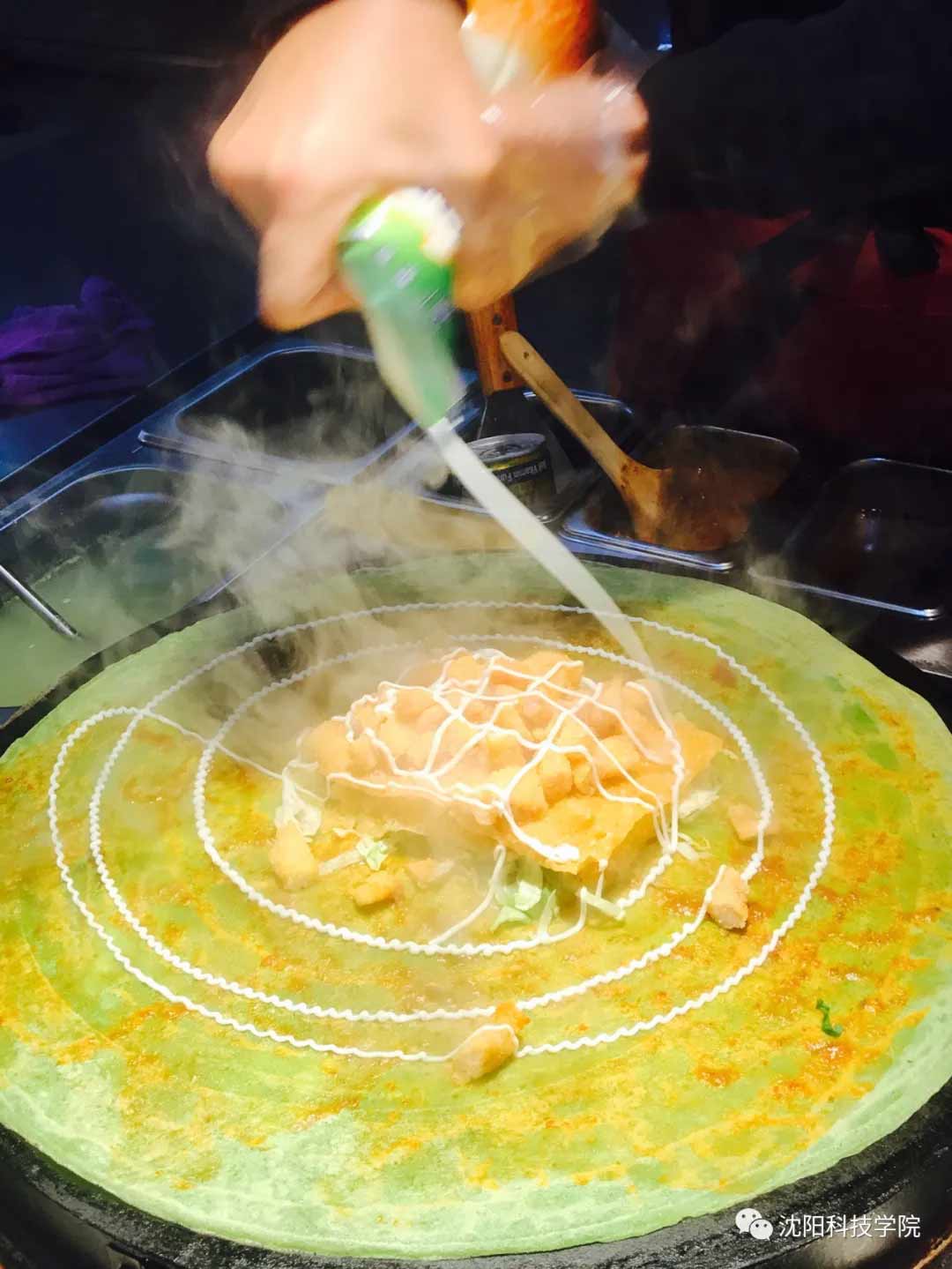 将面糊摊开,铁板慢煎,铺上蛋液,撒上芝麻,放上薄脆、蔬菜加以面酱、葱花、辣条、鸡柳点缀提香,这道让沈科人难以忘怀的煎饼果子就加工制作完成啦!“啊呜”一口咬下去,酥脆与软糯交织,口齿留香,这就是幸福的味道。