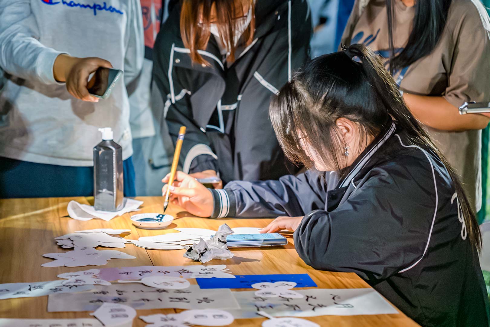 圆月初升,微风徐徐。师生来到足球场,赏花灯、猜灯谜、吃月饼、看表演。一排排谜语随风飘荡,跃于红纸上,大家手持灯谜红纸,一同思考、讨论,争相破解谜底,共享解题的乐趣;静远书斋社的同学们当场创作书法作品,一展笔功,字里行间尽是最真挚的祝福与思念;一曲优美的汉服舞蹈《南乔枝》,婀娜的舞姿步步生花,让人如痴如醉;一曲《如愿》,唱出了对亲人的思念和对未来美好的期盼。