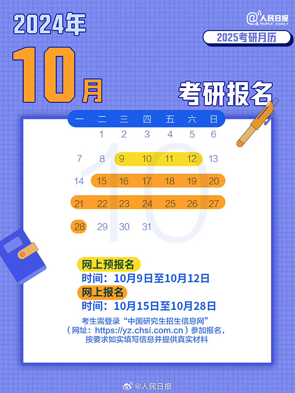 2025年全国硕士研究生招生考试正式报名时间:2024年10月15日至10月28日 每天早9:00—晚22:00