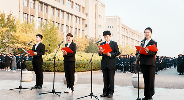 随后,来自应用化学专业的李政欣、网络与新媒体专业的徐文博、会计学专业的杨梓祺,以及网络与新媒体专业的刘传戈上以《学习抗美援朝精神 争做新时代强国先锋》为题作国旗下的演讲。四位学生代表的演讲内容紧扣抗美援朝精神,回顾了那段波澜壮阔的历史,展现了无数中国人民志愿军为国家和人民奉献一切的伟大情怀。精彩的演讲激励在场的每一个人,增强了民族自豪感和历史使命感。