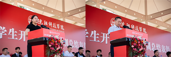 校领导张丽影、郭秀丽、崔国生、田焱、肖士中分别宣读关于表彰2025年学生军训优胜营、先进连队、军训标兵、优秀教官、内务卫生优秀寝室、内务卫生优秀个人的决定。随后,校领导为获奖集体和个人颁奖。