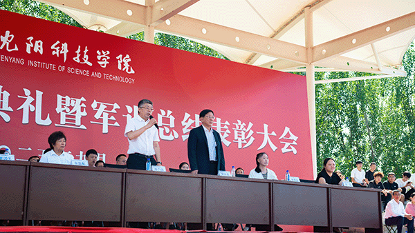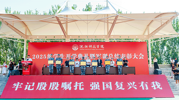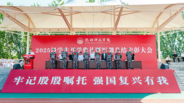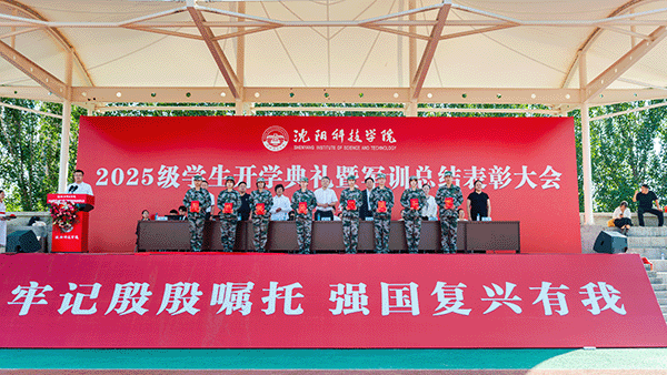 校长宋吉鑫作了题为《逐梦沈科 共赴未来》的讲话。他指出,在纪念中国人民抗日战争暨世界反法西斯战争胜利80周年阅兵活动的激励和鞭策下,同学们圆满完成了军训任务,经历了大学生活的第一课,晒黑了皮肤,强健了体魄,磨炼了意志。在此,他向全体新生提出三点希望,与之共勉:一是志存高远,树立远大理想。理想是灯塔与引擎,周恩来总理、袁隆平院士因有理想而成就非凡。大家要结合自身特长树立理想,不懈奋斗成就无悔人生。二是博学笃行,做到学思践悟。遵循校训,广泛涉猎知识,拓宽视野,培养综合素养。学会思考,提高思维与创新能力,将知识转化为能力,让读书成为生活一部分。三是种德修身,培养良好品德。以“德才兼备、知行合一”规范言行,诚实守信、尊老爱幼、团结友爱,积极参加社会实践,培养社会责任感,从身边小事做起,做受社会欢迎之人。四是勇毅前行,做生活的强者。勇于有梦、善于圆梦,利用好大学时光,坚持学习,构建知识能力体系,用其认识和改造世界。