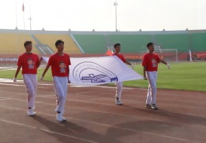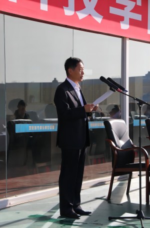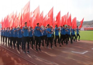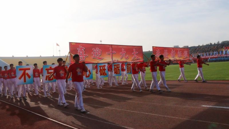 全体师生高唱《义勇军进行曲》后,副校长王喜魁致开幕词。他指出,体育工作是学校教育教学的重要组成部分。多年来,我校始终秉承强化体能、传承技能、和谐发展、终身健康的体育教育宗旨,倡导学生“走出宿舍、走向操场”,校园体育文化建设一派欣欣向荣。他希望全体运动员拼搏进取、奋发勇为;希望全体裁判员恪尽职守、公正裁判;希望全校师生能够通过举办运动会,掀起热爱运动、崇尚健康的热潮,进一步提升我校竞技体育运动水平,推动我校体育事业再上新台阶!随后,运动员代表吴春雪同学和总裁判长梁新鑫老师分别登上主席台宣誓,表达了顽强拼搏和公正评判的决心。