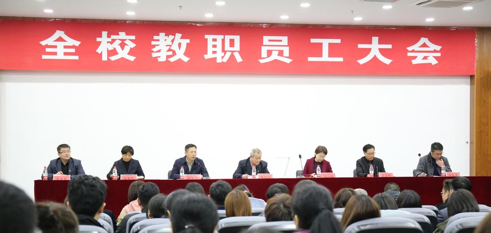 3月20日下午,我校在图书馆多功能报告厅召开了2019年春季学期全体教职员工大会。校领导杨化仁、王一女、张向东、王喜魁、张丽影、杨春光、高洪震出席大会并在主席台前就座;全校各单位、部门主要负责同志和教职员工共计300余人参加了本次大会。大会由副校长张向东主持。