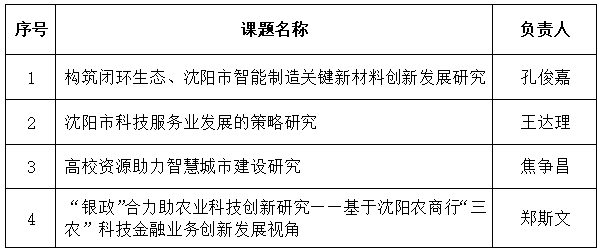 近年来,我校高度重视决策咨询类课题的申报工作,积极鼓励广大教学科研人员申报相关课题,力争为沈阳全面振兴、全方位振兴过程中亟需研究和解决的问题建言献策。今后,我校将继续聚焦推动沈阳市高质量发展,加大指导及引领力度,整合科技资源,充分发挥学校特有的“智库”作用,为沈阳市社会经济发展做出更大的决策支持和贡献。