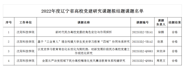 按照《中共辽宁省委教育工作委员会关于开展2022年度辽宁省高校党建研究课题结题工作的通知》(辽委教办〔2024〕2号)有关要求,辽宁省委教育工委组织开展了2022年度辽宁省高校党建研究课题结题工作,经教育工委初审、专家评审、教育工委委务会审议通过,我校4项课题全部获批结题。